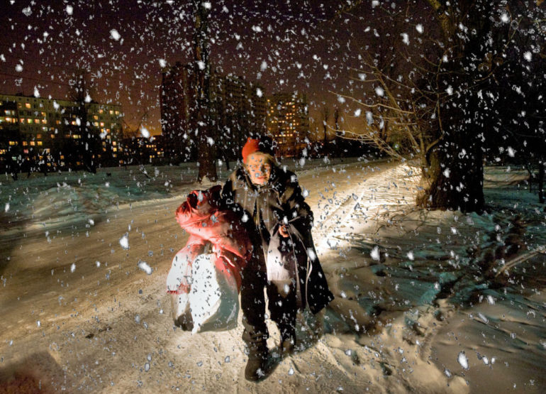 Piotr, Maxim et Andreï se sont réfugiés dans cet immeuble à l’abandon. Au sous-sol ils ont pu transformer une vaste cave en un refuge de fortune. Protégés des intempéries, ces trois rescapés d’un hiver particulièrement rude, ont longuement hésité d’allumer un feu en ces lieux, de peur d’être complétement enfumés. Mais à l’étage supérieur, ouvert à tout vent, c’est mission impossible. Et là, dans la cave, il fait froid, humide. Le rare éclairage provient de la cage d’escalier.