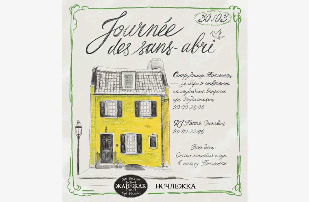 De nombreuses activités sont prévues. Un concert d’orchestre de rue aura lieu à Moscou près des bureaux de l’un de nos partenaires – une campagne d’affichage intitulée « Espace de vie » (une métaphore soulignant que la surface de toute publicité est plus grande que l’espace de vie disponible pour une personne sans-abri) sera lancée – une œuvre d’art sur le thème du sans-abrisme, réalisée par l’artiste pétersbourgeois Misha Marker, sera crée – un restaurant reversera une partie des recettes à Nochlechka – Andrey Chapaev donnera une conférence sur l’histoire du sans-abrisme en Russie – une table ronde sur le sans-abrisme se tiendra dans un bar de Saint-Pétersbourg – et plusieurs articles seront publiés dans les médias.
