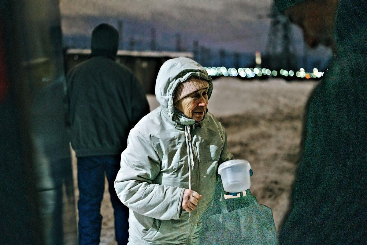 Eh bien, il y a du monde ce soir, s’exclame Oleg Kononenko, le conducteur du Bus de Nuit. Éclairée par les phares du véhicule, la file des crève-la-faim est conséquente.